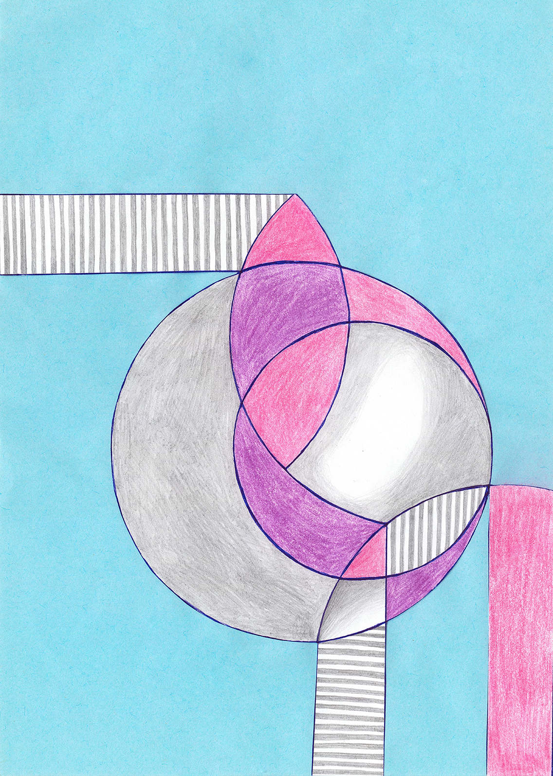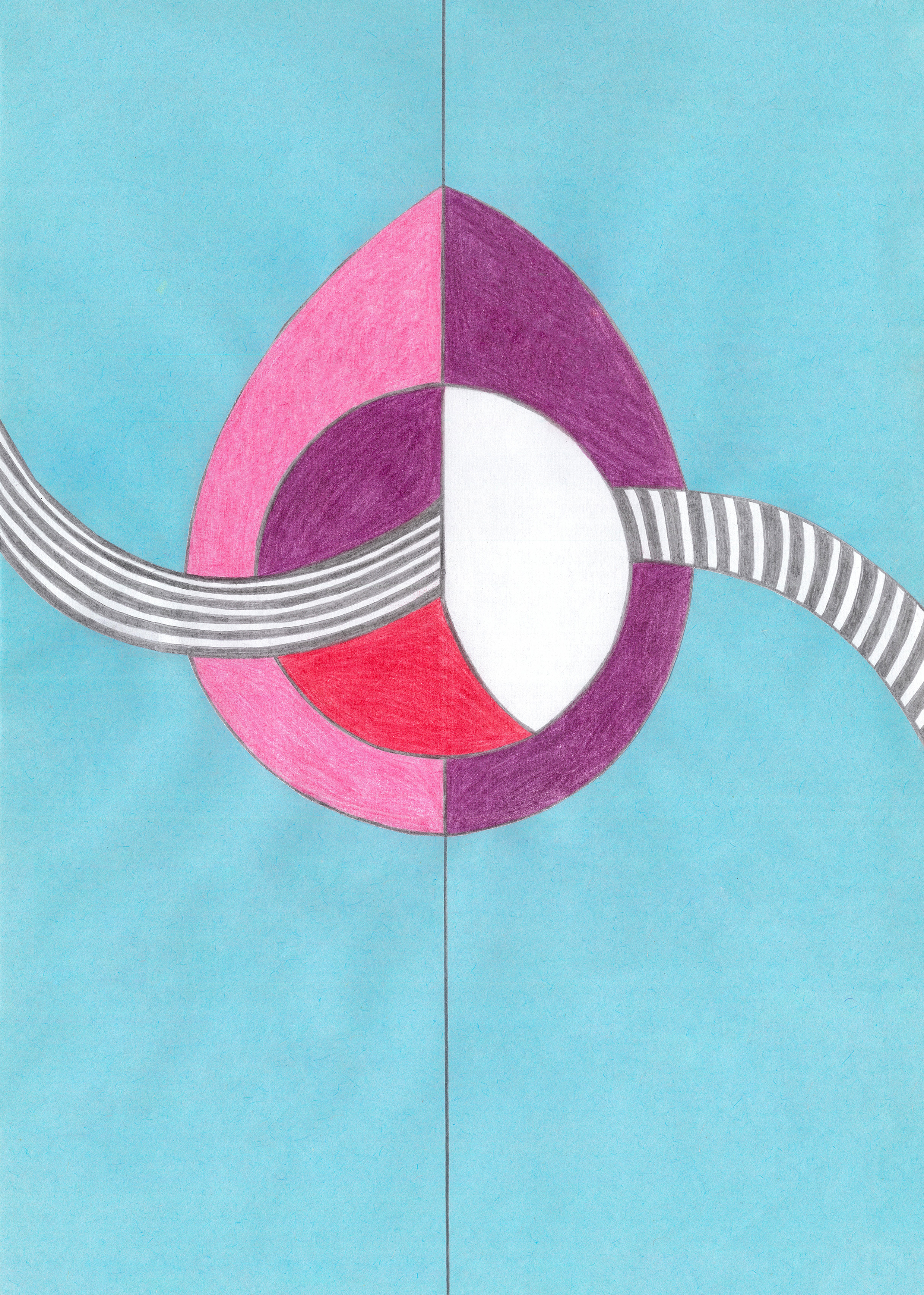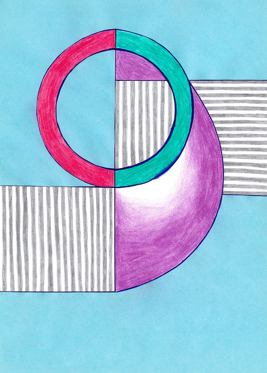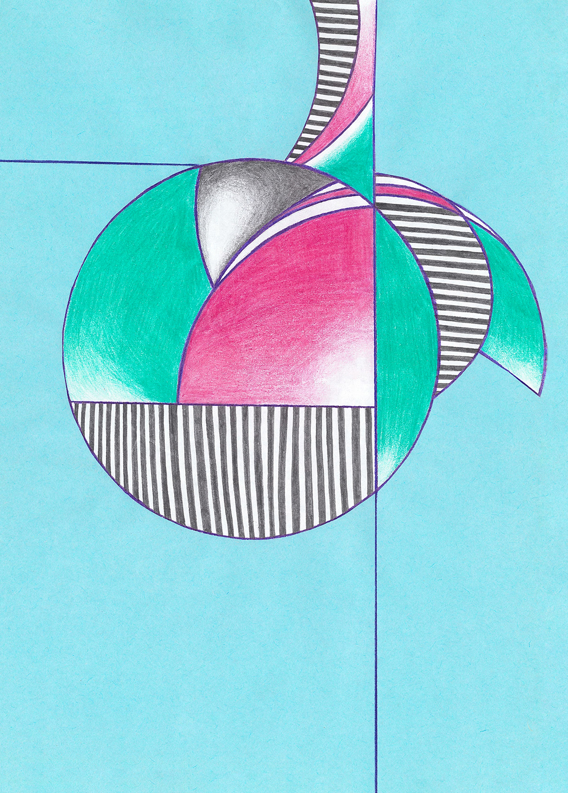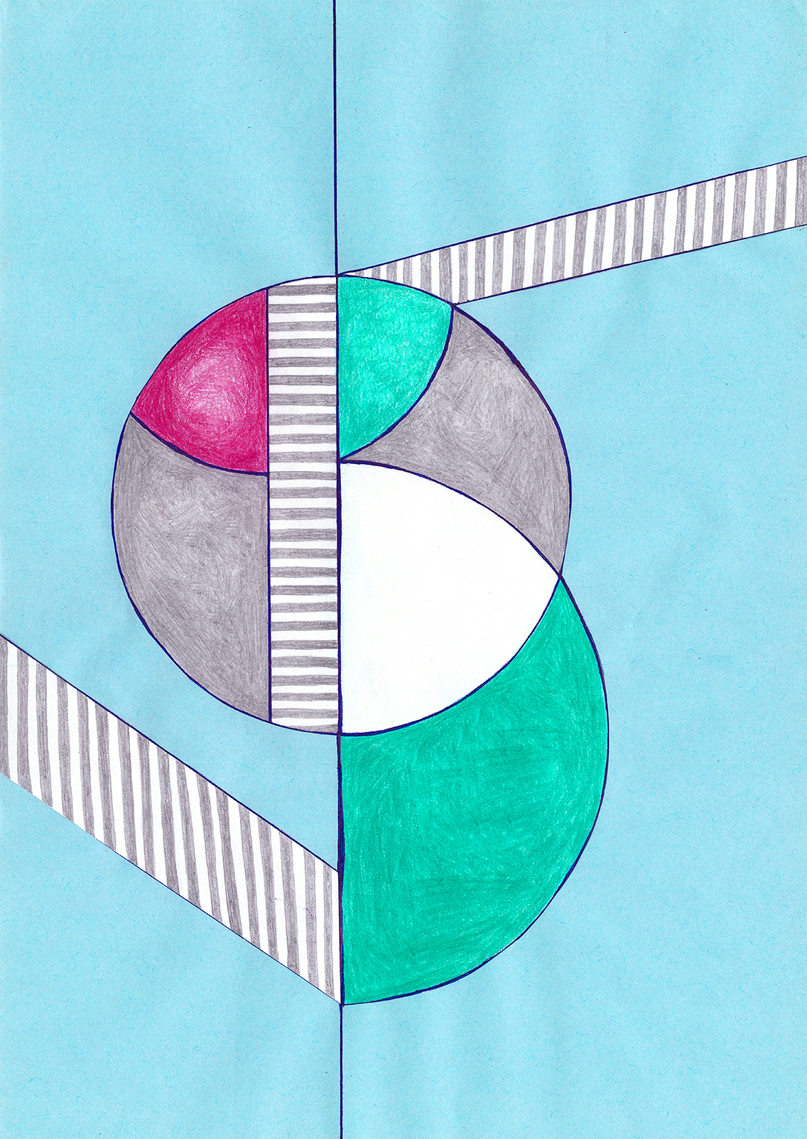 Linien, Kreise, Streifen, Flächen, rechte Winkel. Mit Hilfe von Zirkel und (Kurven-) Lineal konstruierte ich zweidimensionale Gebilde. Die Reduktion der Farben zwang mich zu Entscheidungen. Die geometrischen Werkzeuge dienten mir als Orientierungshilfe auf dem weißen Blatt Papier, bevor ich die Zeichnung mit Schere und Klebstoff weiter bearbeitete. Für mich bedeutete die Verwendung von derartigen Hilfsmitteln eine Einschränkung meiner Freiheit. Meine vorherigen Freihandzeichnungen waren geprägt von Fantasie und spielerischer Leichtigkeit. Als mir beides allerdings in meinem privaten Leben zum Verhängnis wurde, suchte ich nach einer zeichnerischen Lösung, die mir Halt und Stabilität gab. Ich unterwarf mich den strengen „Regeln“, die mir Zirkel und Lineal boten. Es gab kein Ausufern, kein Herumspinnen, kein Fantasieren und kein aus dem Rahmen fallen. Stattdessen ließ ich mich tragen von strukturgebenden Methoden – und das nicht nur in meiner künstlerischen Arbeit.