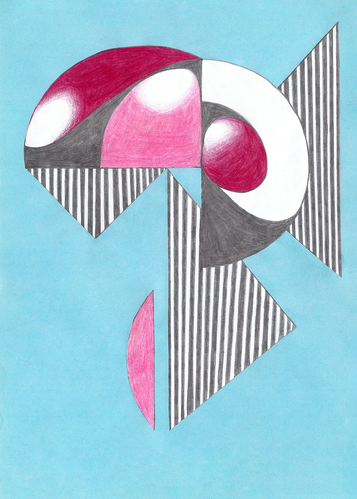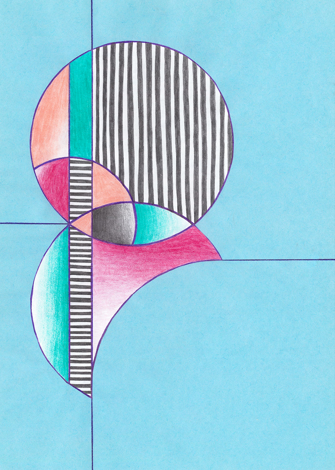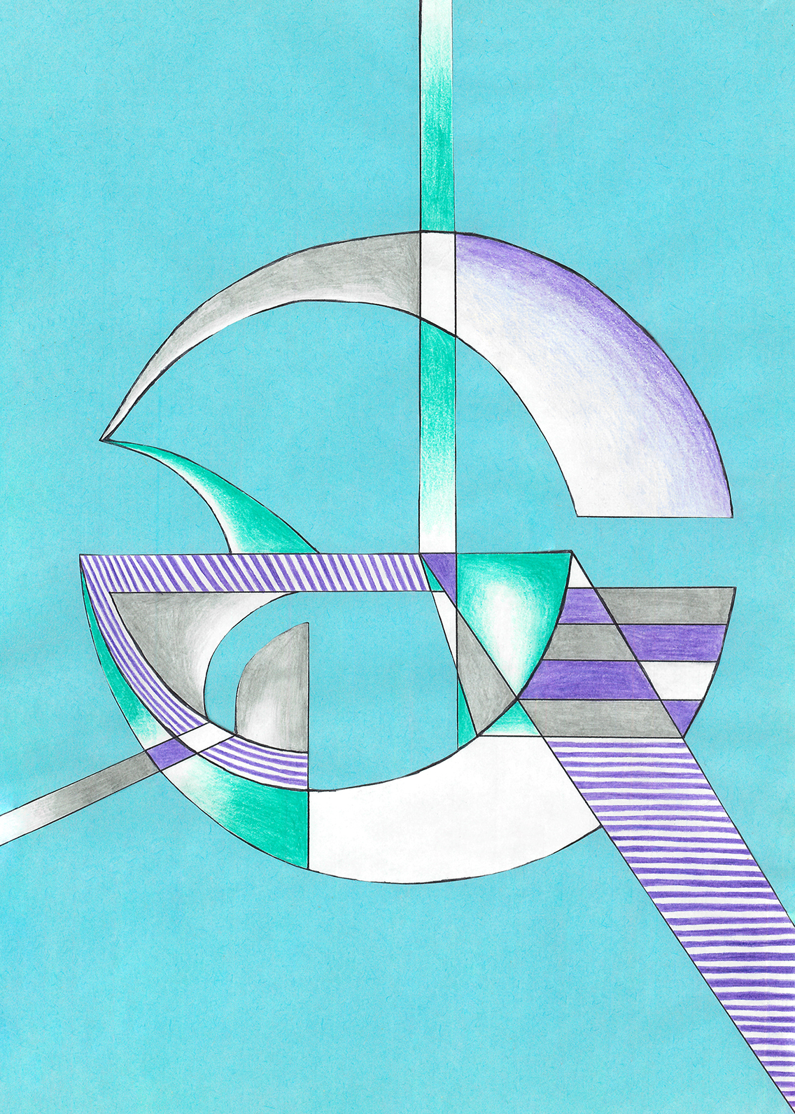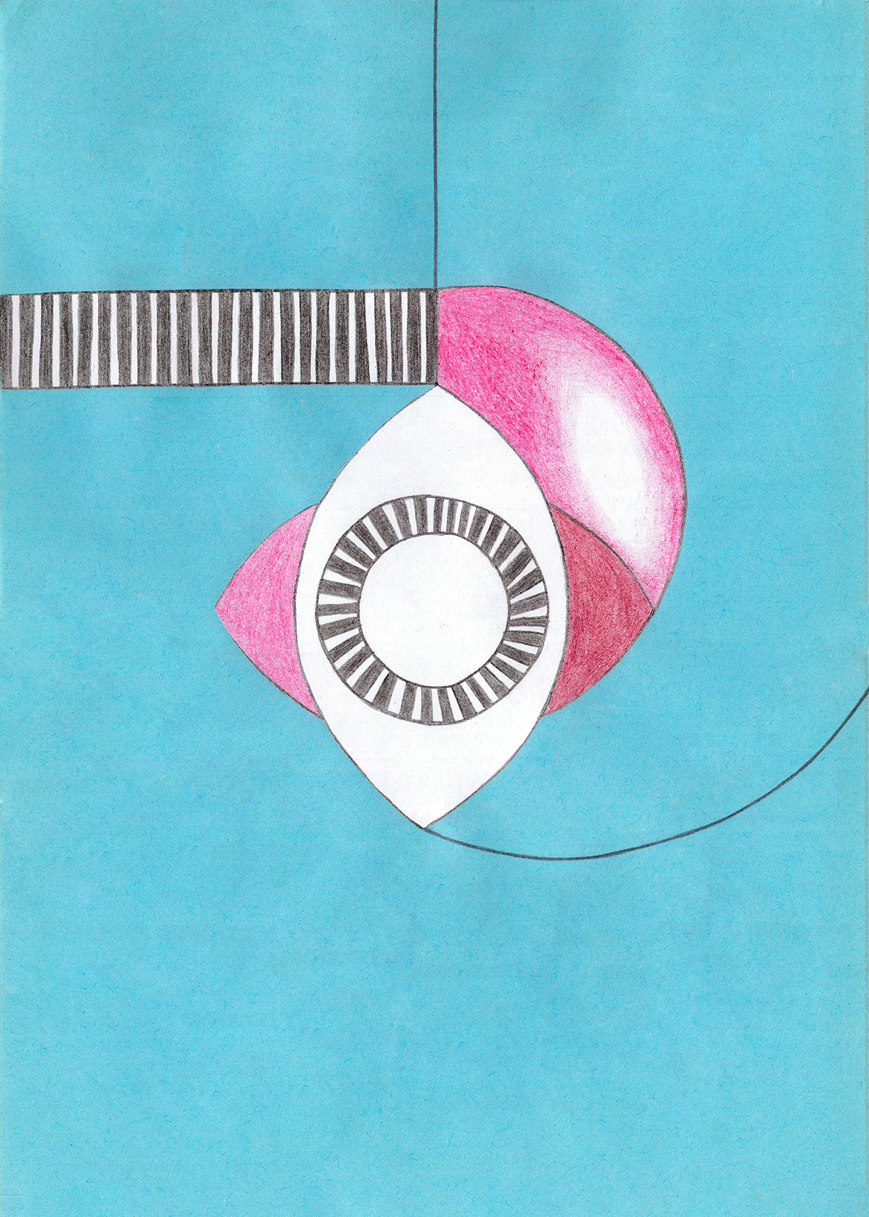 Linien, Kreise, Streifen, Flächen, rechte Winkel. Mit Hilfe von Zirkel und (Kurven-) Lineal konstruierte ich zweidimensionale Gebilde. Die Reduktion der Farben zwang mich zu Entscheidungen. Die geometrischen Werkzeuge dienten mir als Orientierungshilfe auf dem weißen Blatt Papier, bevor ich die Zeichnung mit Schere und Klebstoff weiter bearbeitete. Für mich bedeutete die Verwendung von derartigen Hilfsmitteln eine Einschränkung meiner Freiheit. Meine vorherigen Freihandzeichnungen waren geprägt von Fantasie und spielerischer Leichtigkeit. Als mir beides allerdings in meinem privaten Leben zum Verhängnis wurde, suchte ich nach einer zeichnerischen Lösung, die mir Halt und Stabilität gab. Ich unterwarf mich den strengen „Regeln“, die mir Zirkel und Lineal boten. Es gab kein Ausufern, kein Herumspinnen, kein Fantasieren und kein aus dem Rahmen fallen. Stattdessen ließ ich mich tragen von strukturgebenden Methoden – und das nicht nur in meiner künstlerischen Arbeit.