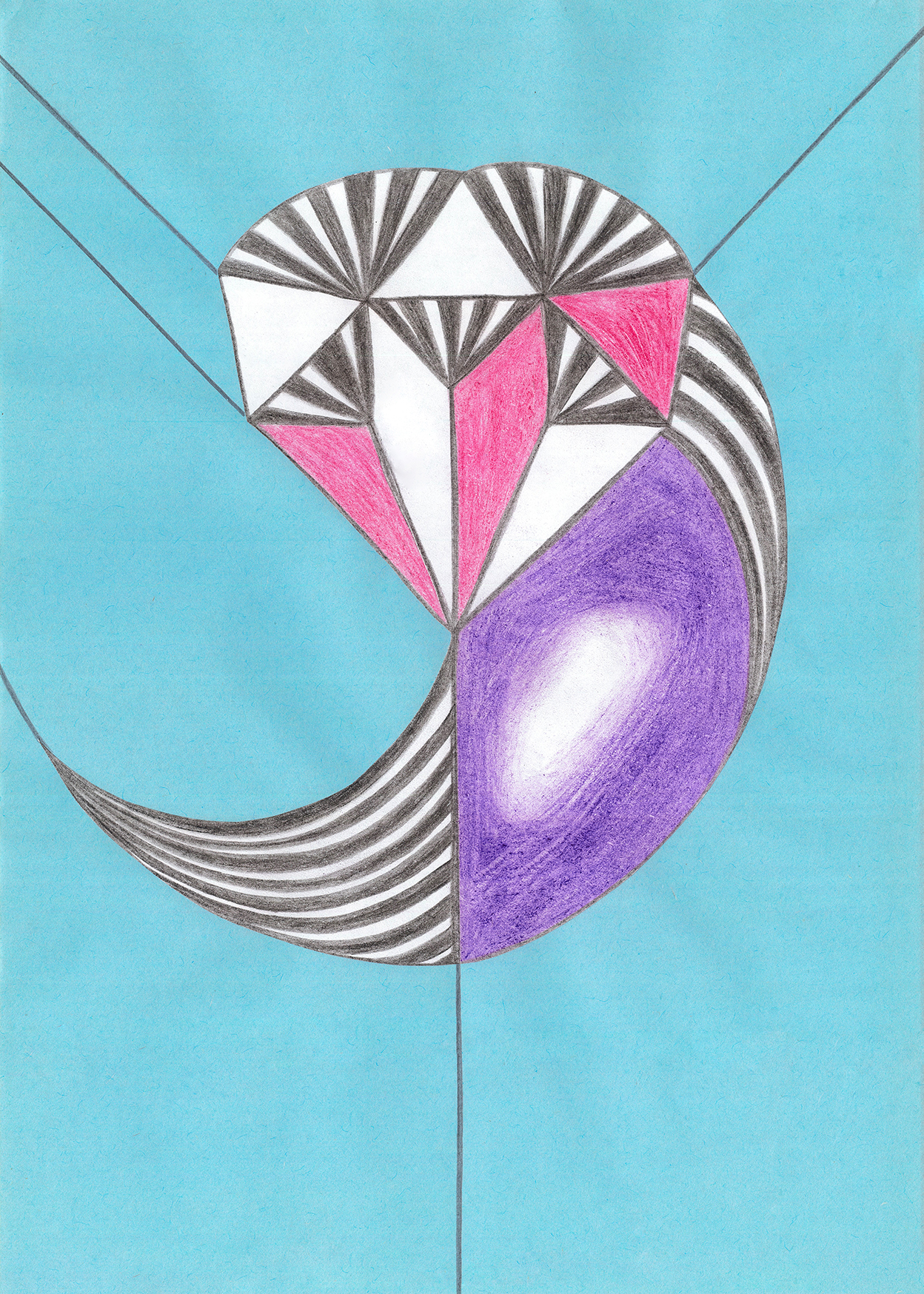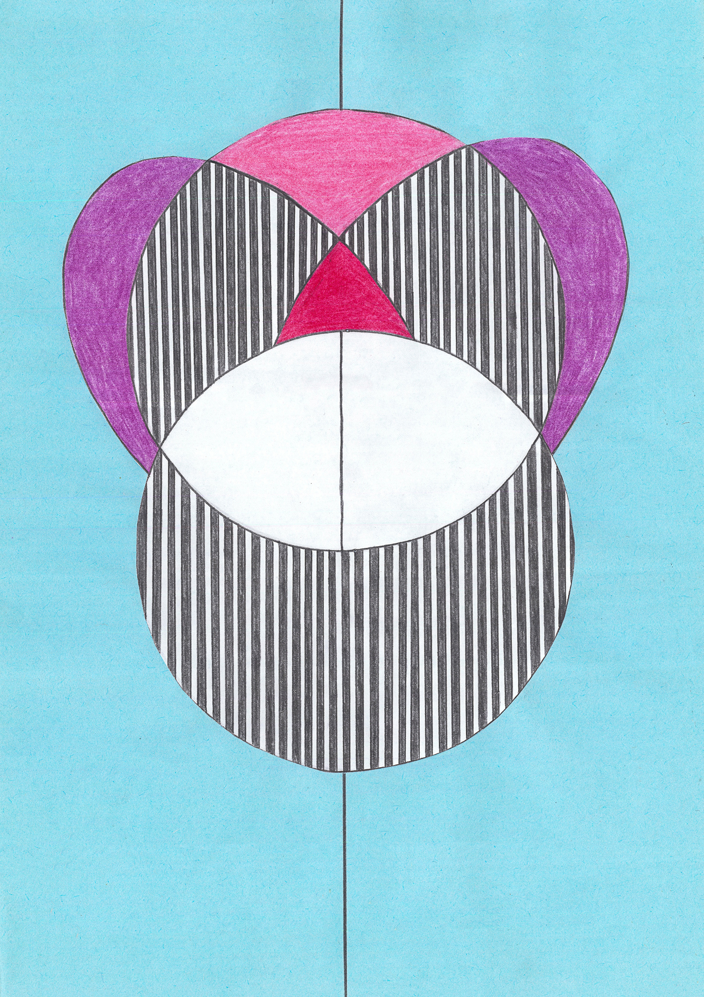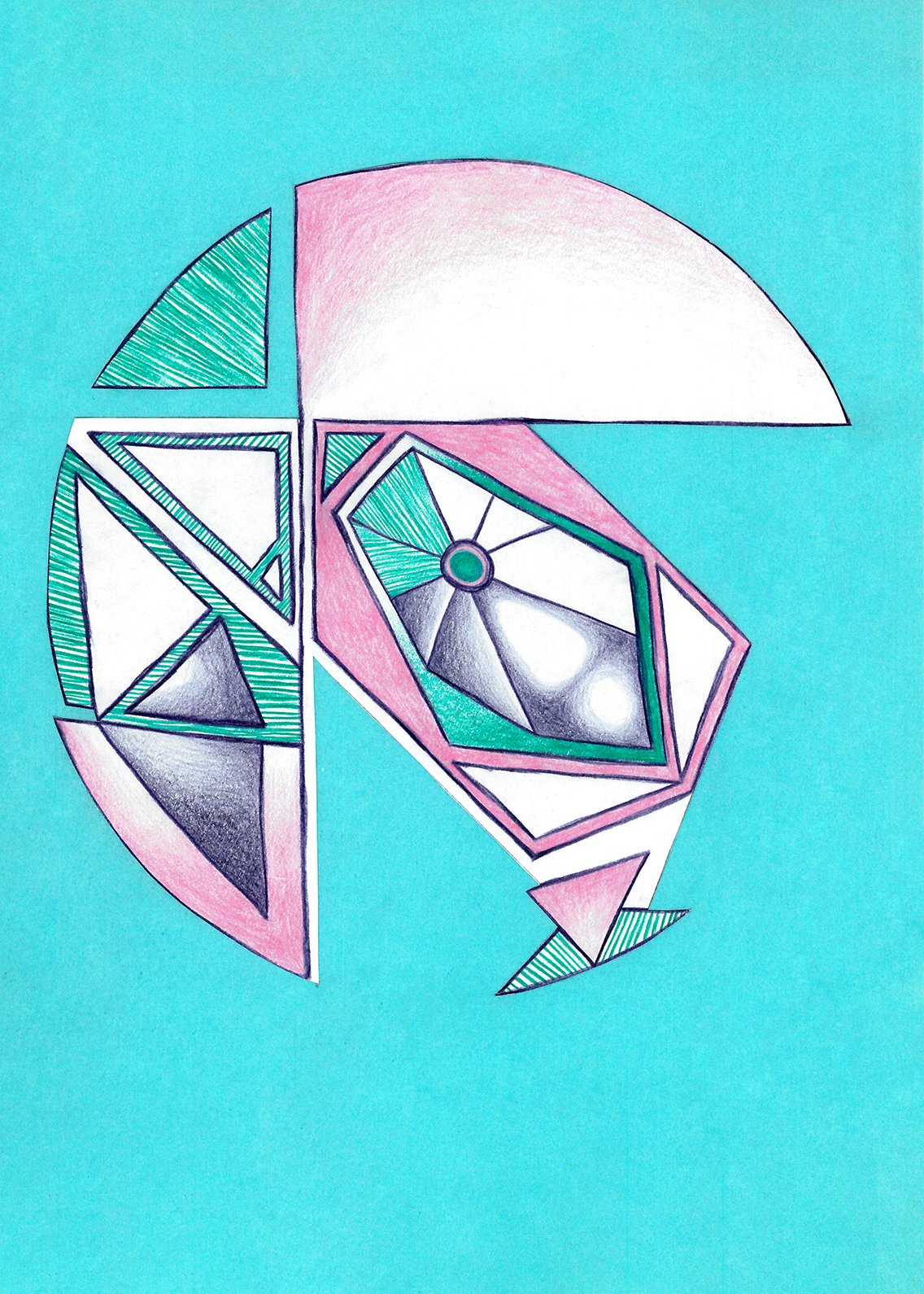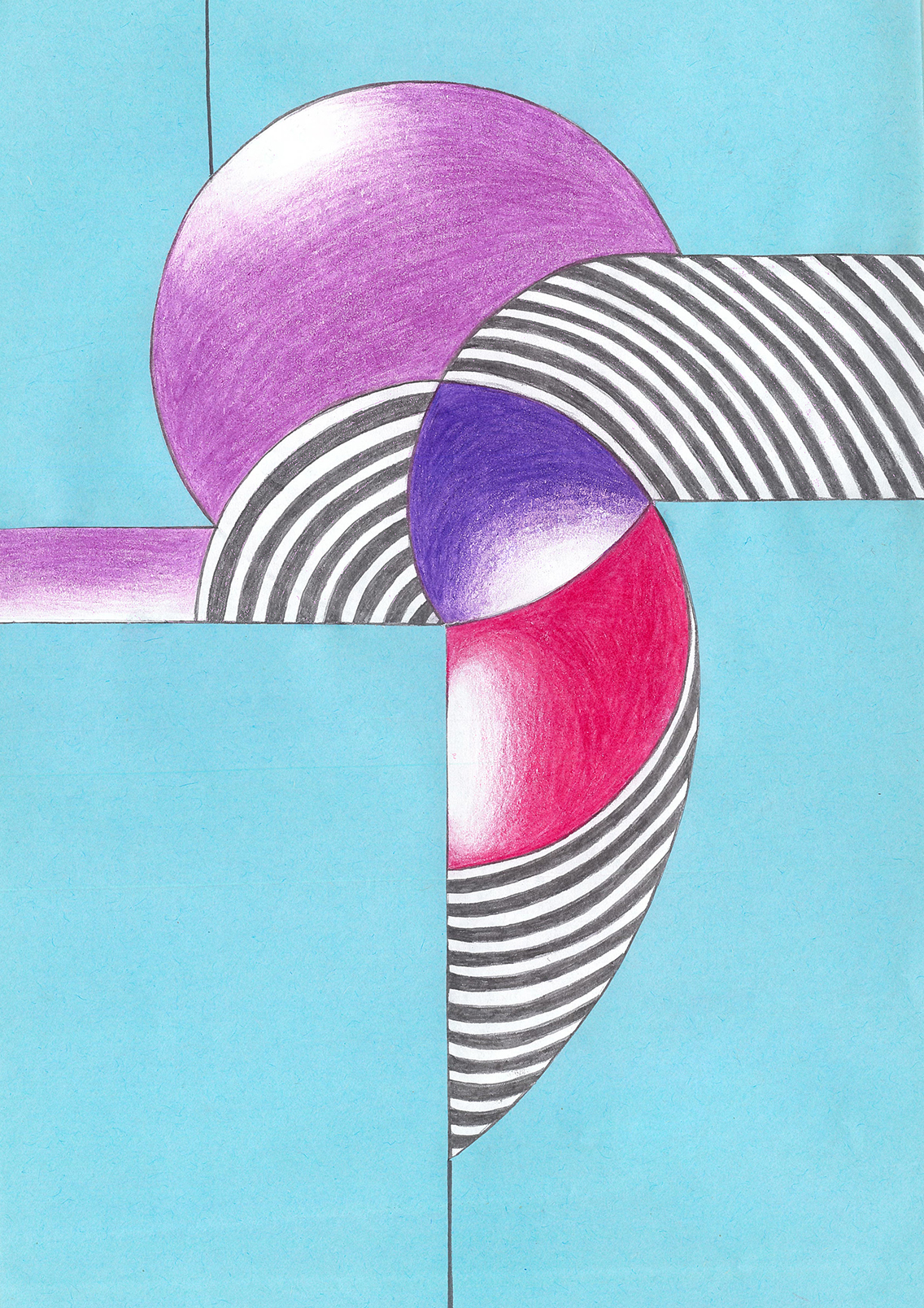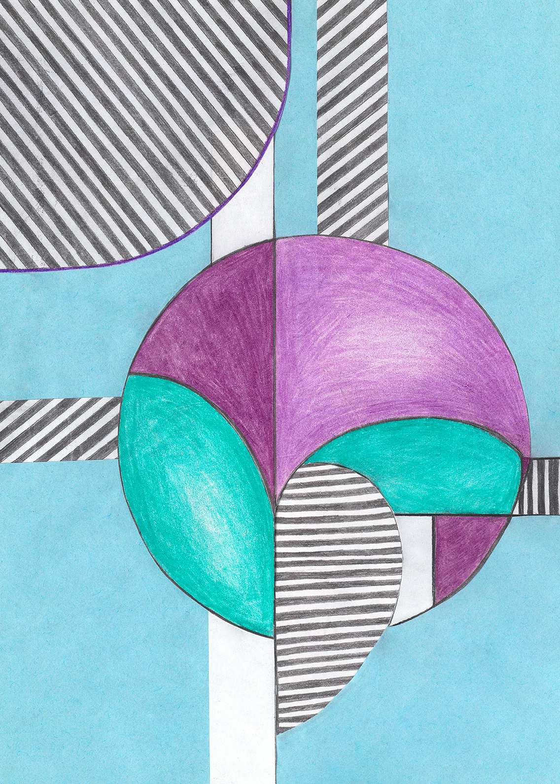 Linien, Kreise, Streifen, Flächen, rechte Winkel. Mit Hilfe von Zirkel und (Kurven-) Lineal konstruierte ich zweidimensionale Gebilde. Die Reduktion der Farben zwang mich zu Entscheidungen. Die geometrischen Werkzeuge dienten mir als Orientierungshilfe auf dem weißen Blatt Papier, bevor ich die Zeichnung mit Schere und Klebstoff weiter bearbeitete. Für mich bedeutete die Verwendung von derartigen Hilfsmitteln eine Einschränkung meiner Freiheit. Meine vorherigen Freihandzeichnungen waren geprägt von Fantasie und spielerischer Leichtigkeit. Als mir beides allerdings in meinem privaten Leben zum Verhängnis wurde, suchte ich nach einer zeichnerischen Lösung, die mir Halt und Stabilität gab. Ich unterwarf mich den strengen „Regeln“, die mir Zirkel und Lineal boten. Es gab kein Ausufern, kein Herumspinnen, kein Fantasieren und kein aus dem Rahmen fallen. Stattdessen ließ ich mich tragen von strukturgebenden Methoden – und das nicht nur in meiner künstlerischen Arbeit.